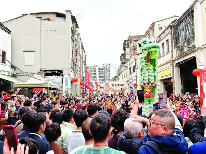 大年初一,水東街的醒獅表演吸引了很多市民游客駐足觀看。惠州日報記者張藝明 攝