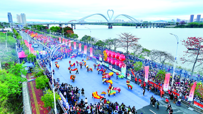惠州日?qǐng)?bào)訊 (記者香金群)金馬踏春開(kāi)盛景,非遺煥彩耀鵝城。3月1日上午10時(shí),隨著一匹彩色“飛馬”御風(fēng)而起,“金馬踏春”——2026惠州多彩非遺鬧元宵大巡游在萬(wàn)眾期待中拉開(kāi)帷幕。近1300名非遺傳承人和表演者身著盛裝,踏歌而行,將巡游路線化作一條流淌著文化與歡樂(lè)的河流。