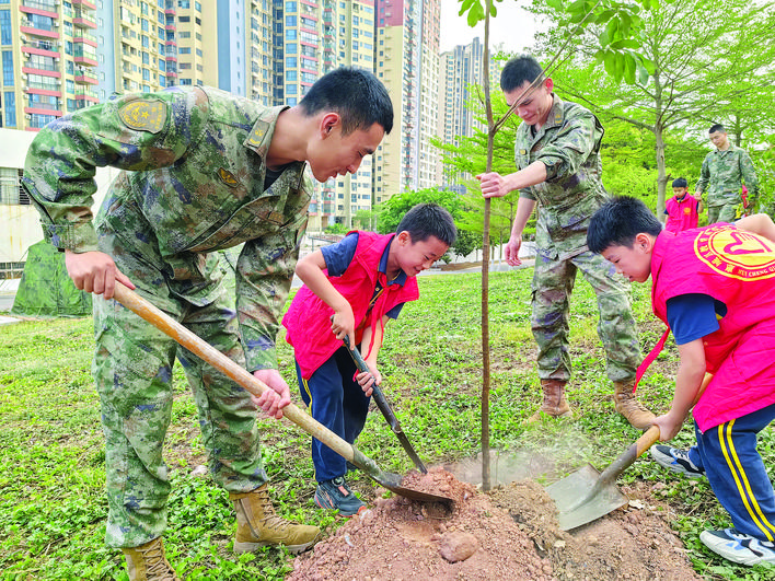 官兵和學生配合默契,共植新綠。 圖片來源:惠州日報記者彭紅霞 通訊員陳婷 呂嘉琪