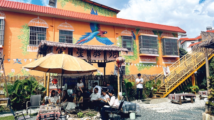 走進金星驛站,一只展翅高飛的藍色大鳥墻繪分外引人注目,窗戶則裝飾成鳥籠,別具一格。環(huán)看四周,籬笆作墻,綠植高低錯落,院子中“小溪”流水潺潺,溪旁有一座小亭獨立,讓人不禁生出“坐看云卷云舒”的閑適之情。據(jù)金星驛站主人溫嘉玲介紹,她回家探親時發(fā)現(xiàn)村里環(huán)境優(yōu)美、交通便利,于是仔細拾掇爺爺留下的廢舊小院,打造了這方“美麗庭院”,沒想到一下子成為網(wǎng)紅打卡點。