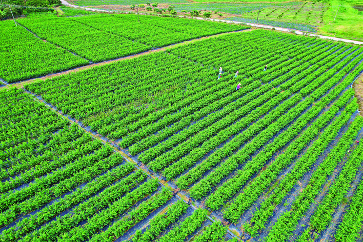 清晨的象頭山腳下,薄霧尚未散盡,博羅縣泰美鎮(zhèn)新塘村的樹仔菜種植基地已熱鬧起來。鮮綠的嫩芽在微風(fēng)中舒展,30多位村民穿梭于齊腰高的菜畦間,指尖輕掐,成筐的鮮嫩莖葉便在田埂旁堆起。這片今年2月首批栽種的樹仔菜,7月剛進(jìn)入采收期就展現(xiàn)出驚人活力——不僅讓曾沉寂的撂荒地重?zé)ㄉ鷻C(jī),更在泥土與嫩芽的互相映襯中,奏響了鄉(xiāng)村振興的富民樂章。