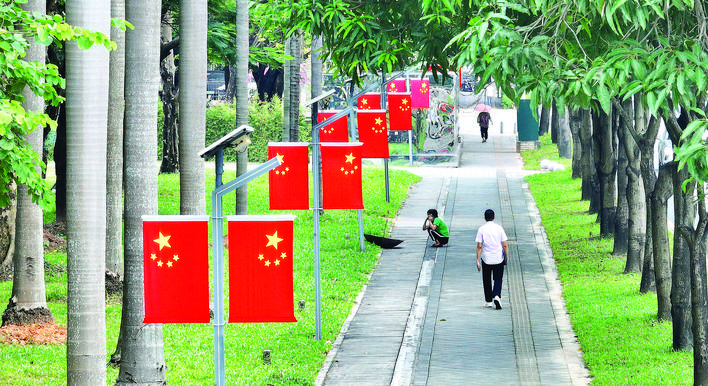 國慶節(jié),惠州城區(qū)五星紅旗掛滿大街小巷,滿眼皆是“中國紅”,用“中國紅”裝扮道路、公園和景區(qū),將國慶的氛圍感拉滿,洋溢著喜慶熱烈的節(jié)日氣氛。(惠州日報記者鐘暢新)