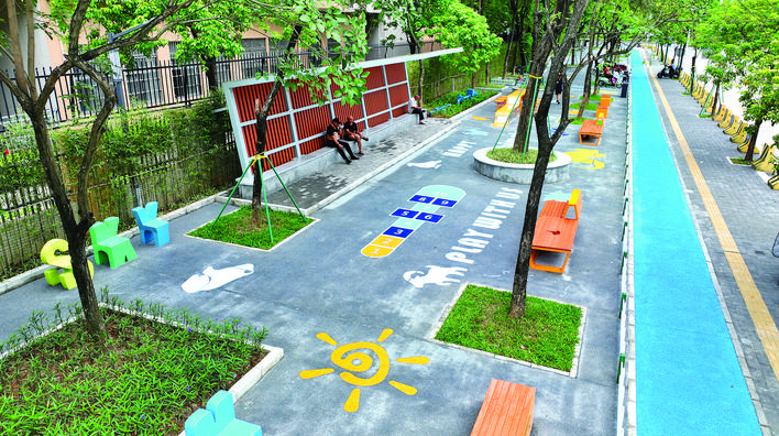 景觀煥新,充滿童趣:地面繪制的六邊形、五角星及太空星球圖案仿佛躍動(dòng)的音符,充滿童趣。