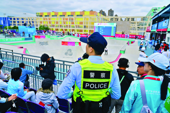 惠州公安在十五運(yùn)會(huì)賽事現(xiàn)場(chǎng)開展安保工作。