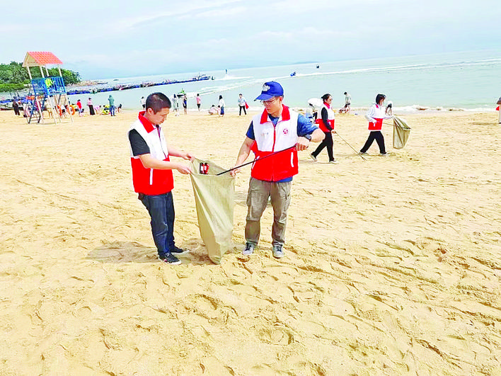 志愿者在沙灘撿拾垃圾。 惠州日?qǐng)?bào)記者賴金朗 特約通訊員黃少卿 葉衍達(dá) 攝