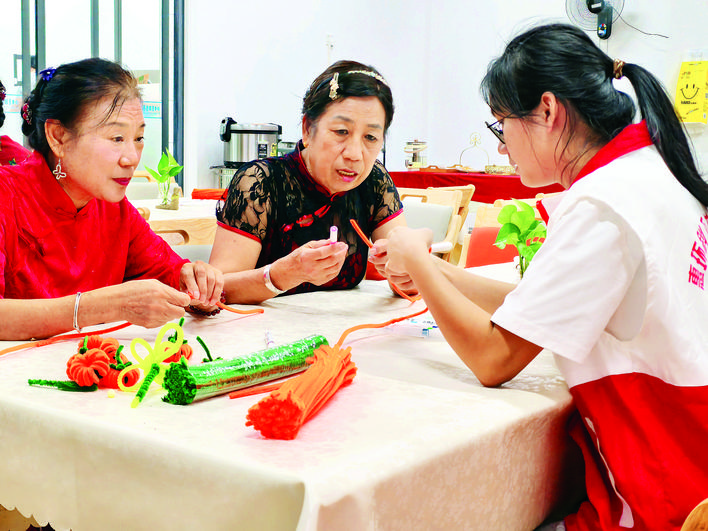 在志愿者的指導(dǎo)下,阿姨們學(xué)做手工。