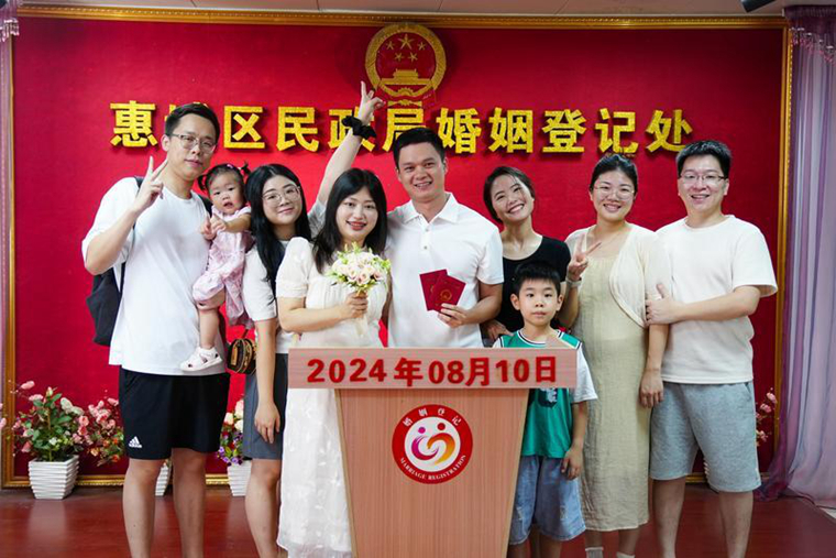 當(dāng)天上午8時(shí)30分許,記者來(lái)到惠城區(qū)民政局婚姻登記處看到,新人們井然有序地在前臺(tái)領(lǐng)表填表,等待窗口叫號(hào)。他們有的身著情侶裝,有的頭戴白紗,有的手捧鮮花,有的帶“親友團(tuán)”前來(lái)見證,讓結(jié)婚登記充滿儀式感。