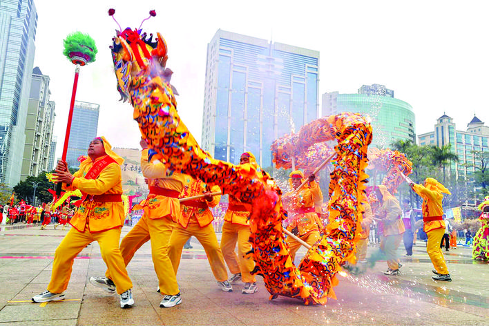 2月24日,龍舞大巡游活動(dòng)現(xiàn)場的舞龍表演。
