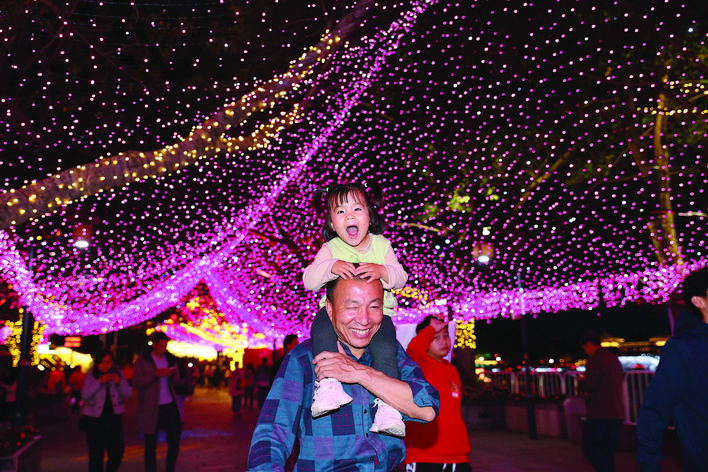 大人背著小孩逛燈會(huì),幸福與快樂寫在臉上。