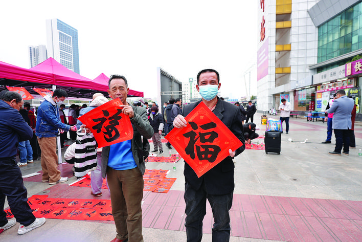 書法家在惠州火車站為旅客免費(fèi)寫春聯(lián)送福字。