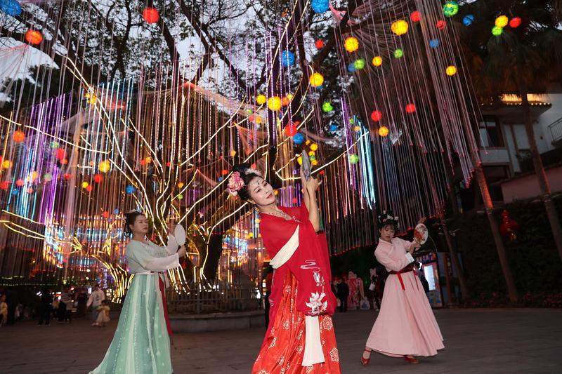 幾名女孩穿著傳統(tǒng)服飾在西湖花燈下跳舞。 圖片來源:惠州日?qǐng)?bào)記者楊建業(yè) 攝