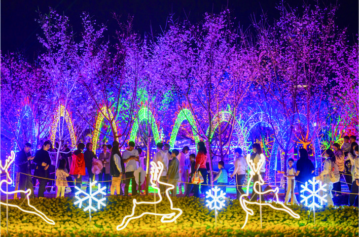 還沒到過嘉年華會場的朋友,不妨約上三兩知己,一起在花林間享冬日溫暖陽光,觀美麗粉色櫻花壓滿花枝,流光溢彩、夢幻迷離。