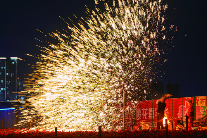 “聚是一團火,散開滿天星”,素有“民間焰火之最”美譽的打鐵花,是古時鐵匠們?yōu)榱藨c祝豐收、祈求平安的一種傳統(tǒng)技藝。而今,作為一種非遺文化表演,打鐵花既能營造恢弘壯觀、氣勢磅礴的場面,也點綴著夜幕下獨特而絢麗的風景,是冬日里熾熱又溫馨的浪漫。