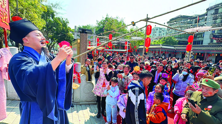 這支接親隊(duì)伍沿樂(lè)群堂湖邊巡游,沿途派發(fā)喜糖、喜果、紅包,“蘇東坡”更與市民游客現(xiàn)場(chǎng)對(duì)詩(shī),答對(duì)就送“利是”,點(diǎn)燃了市民游客的參與熱情,現(xiàn)場(chǎng)氣氛嗨翻天。