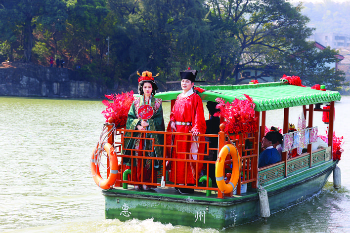 新郎新娘乘坐婚船橫渡惠州西湖。