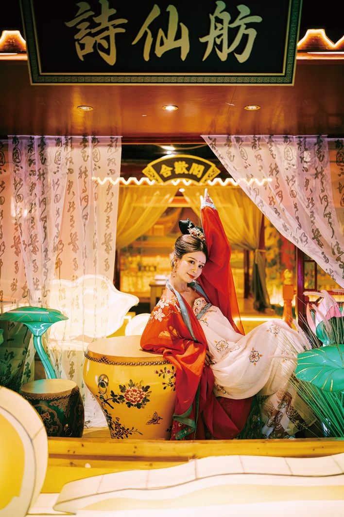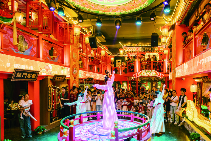 身著唐朝服飾穿梭于店內(nèi)的士兵、侍女,挑著扁擔(dān)的小販,華麗的唐朝歌舞……一場“唐宮夜宴”生動(dòng)浮現(xiàn)。因?yàn)閳鼍暗难由欤鞣N飲食滋味也有了百般變化,讓游客擁有更加豐富、深刻的用餐感受。