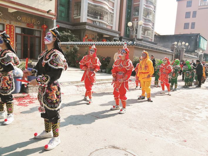 大年初二是傳統(tǒng)的“回門日”,就是女兒回娘家、女婿給岳父岳母拜年的日子。我?guī)е胰藦慕谊柺袇^(qū)回到汕頭市潮陽區(qū)。在這里,過年氛圍最濃的傳統(tǒng)民俗活動(dòng)是潮汕英歌舞。英歌舞是在潮汕地區(qū)無人不知、無人不曉的文化藝術(shù),其舞蹈具有濃墨重彩的扮相,融合戲劇、舞蹈、武術(shù)等元素,表演過程中體現(xiàn)了力與美的結(jié)合,表演風(fēng)格大氣、豪邁、激昂、熱烈,讓人過目難忘。