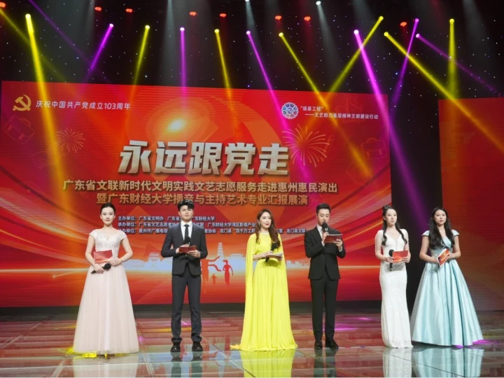 貫徹紅色精神,汲取奮進力量,在中國共產(chǎn)黨建黨103周年之際,7月2日,“永遠跟黨走”廣東省文聯(lián)新時代文明實踐文藝志愿服務(wù)走進惠州惠民演出暨廣東財經(jīng)大學(xué)播音與主持藝術(shù)專業(yè)匯報展演舉行。廣東省文聯(lián)黨組副書記、專職副主席吳華欽,廣東財經(jīng)大學(xué)黨委副書記劉祖華參加活動。